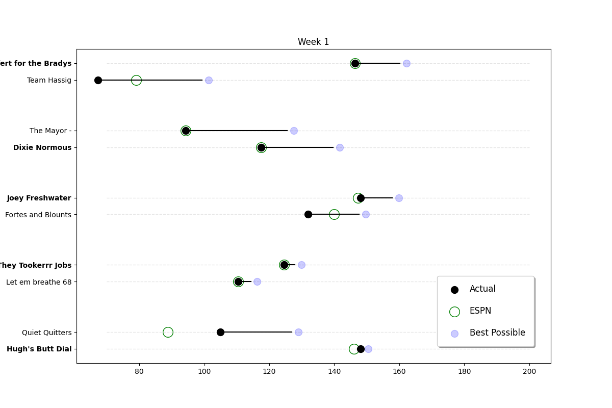 Week one is in the books and we had some great matchups. Nick M took an L in his debut against the Butt Dial. Tyler won the Joey Freshwater Bowl against Chris in a close one. Trevor won in a blowout against Bill. David Eiferted his way to victory against Nick H. In the closest matchup, Alan barely squeaked by with a win against Lee. It’s still early, but Tyler, David, Brian, Alan, and Trevor all look like they could be contenders this year. Chris, Lee, Nick, Bill, and Nick have their work cut out for them if they want to make the playoffs.
