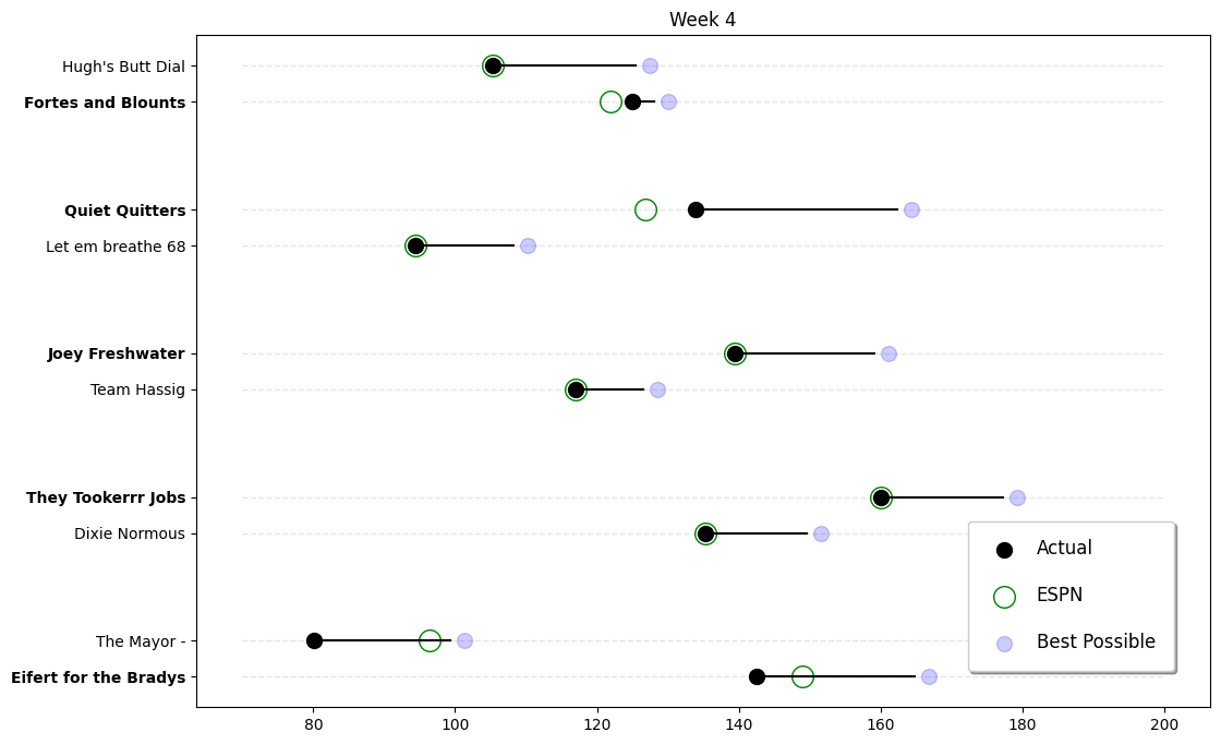 BILL got his ass handed to him this week in a brutal beating by David. It was so bad that BILL is going to have to get a restraining order against David. Trevor also took a beating from Alan. Maybe Trevor should stop being such a DixieNormous and start playing better! Tyler, Brian, and Chris all won their matchups this week. - Fake Commish
