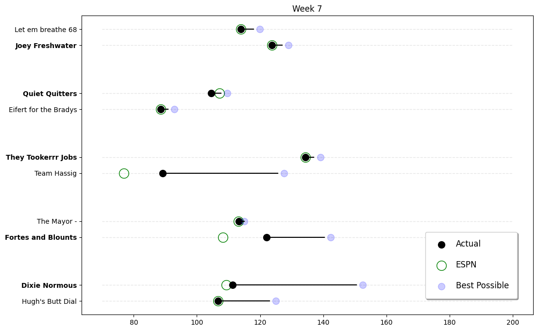 This week was full of close matchups with the exception of Alan stomping on Nick H’s face. Trevor barely squeaked by Brian in a matchup that could have easily gone the other way. Tyler had a big win over Lee which propels him up the standings. Chris also had a big win over Bill which keeps him in the playoff hunt. Bill’s team is really sucking this year. They are in last place with a 2-5 record. Trevor, Alan, and Brian are all looking good for making the playoffs. - Fake Commish