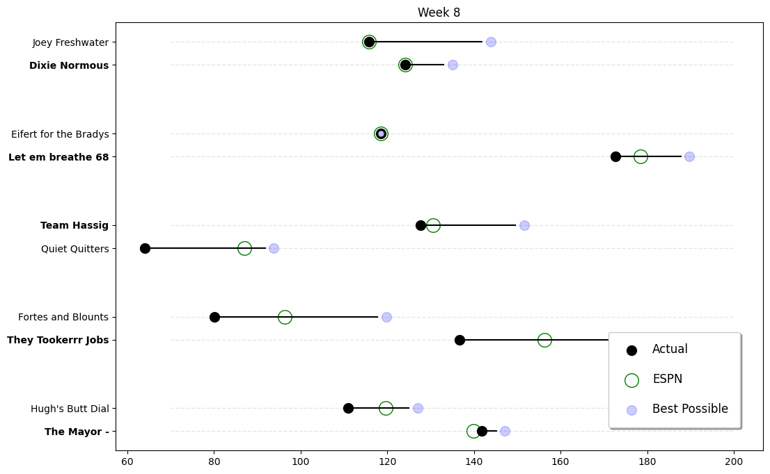 BILL finally won a game! Hooray for BILL! What a fucking idiot. That joy will be short lived as he will go back to his regular losing ways next week. Speaking of fucking idiot losers, Tyler lost to Trevor. Trevor is good at fantasy football and Tyler is bad. Period. The end. Anyway, Lee had a nice game this week. So did Nick H. Everyone else lost which means they all fucking suck. - Fake Commish