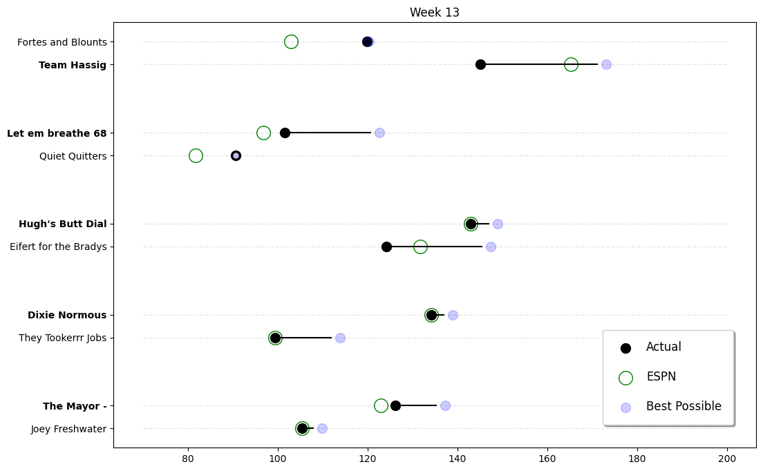 Added Note: That’s likely a wrap for Fake Commish this year. I’ll write the last couple of wrapups for the playoff matchups. It was a tight race for the playoffs and ended in a 5-way tie for the fourth and final spot between David, Tyler, Chris, Brian, and Bill. The tie-breaker (most points forced) went to David. The playoff matchups are 2 weeks long each. First round matchups are: