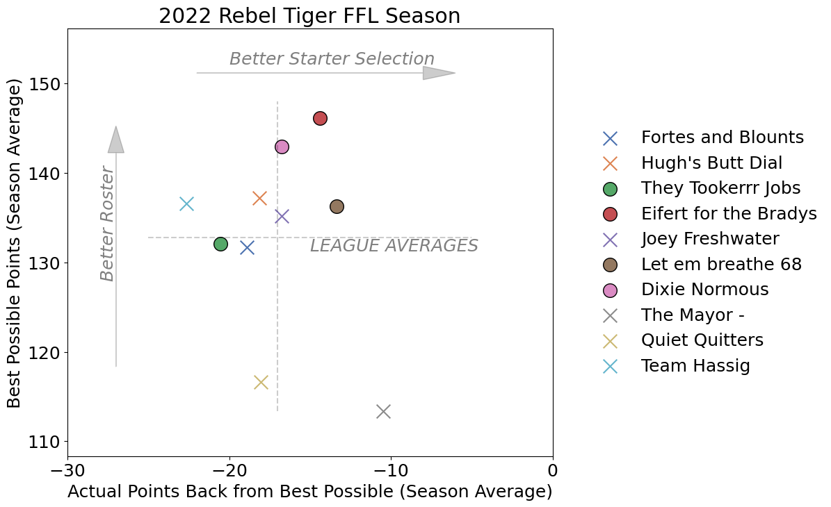 The graph shows who had the strongest rosters and who made the best starter selections. The circles in the graph are teams that made the playoffs. It makes sense to see that 3 of the playoff teams were in the top right (strong roster and good starter selection). Lee didn’t have the strongest overall roster, but he had good selections. Only Bill has better selections, but that’s likely due to his roster being hot garbage with limited tough decisions for selecting starters.