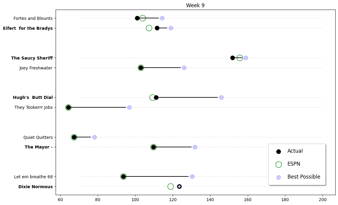 Lee got slapped down hard by Trevor this week, as if someone took their Oreos and shoved them into the toilet. Nick M didn’t stand a chance against Bill, like trying to fight a Viking. Brian threw up a brick wall against Alan’s offense, making it look like Alan was standing in front of The Great Wall of China. Nick H had a nice win this week but still not good enough to make the playoffs. Chris can’t catch a break this season, truly the biggest schmuck in fantasy football. Brian and Tyler are locked in for the playoffs with Lee just outside looking. With only one game separating three teams for two playoff spots it’s gonna come down to the wire! - Fake Commish