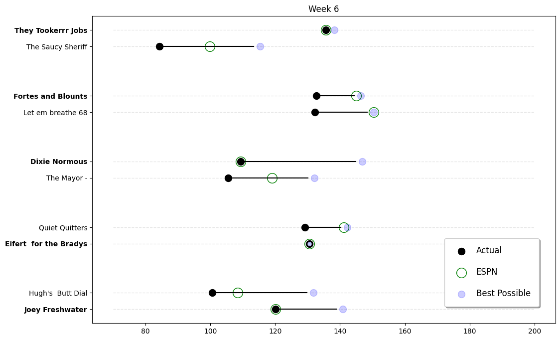 Lastly, Alan delivered a smackdown of epic proportions against Nick H, who looked like he forgot the game was on and scored only 84.2 points—absolute abysmal! Alan’s just out here flexing like he’s got the cheat code to the universe. Meanwhile, Nick H is in a state of despair, resigned to a fate resembling a sad rom-com where the characters never kiss. So here’s to the victors, and to the losers…well, perhaps they should just stick to playing Monopoly! - Fake Commish