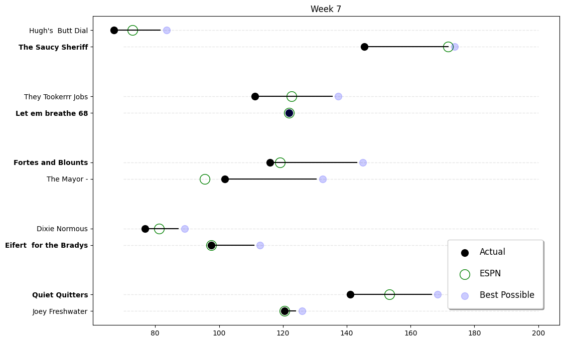 Ladies and gentlemen, gather ‘round because we’ve got tales of glory and shame from Week 7 that would make even Shakespeare shed a tear! Let’s start with Nick M, the Quiet Quitters, who somberly dropped an absolute atomic bomb of 141.06 points on Tyler’s pitiful 120.44. Tyler, buddy, I’m not saying your team was bad, but I’ve seen better performances from a high school musical cast warming up backstage!