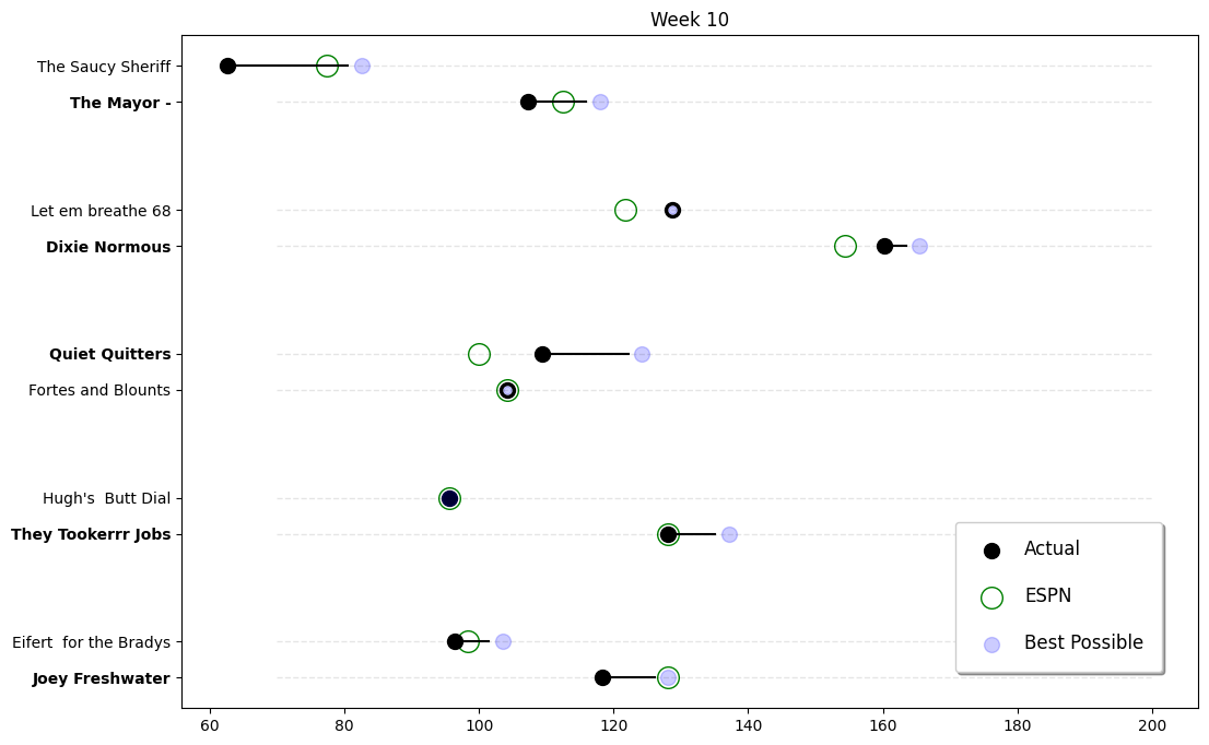 Oh boy, what a week in fantasy football! We’ve got drama, tears, and enough humiliation to fill a novella! First off, let’s hear it for Tyler, the Joey Freshwater of this league, whose 118.3 sits like a king on its ivory throne while David, with his pitiful 96.44, is left wallowing in the mud like a pig at a county fair. I guess “Eifert for the Bradys” didn’t read the fine print that his team wasn’t Brady, but instead a poorly assembled IKEA furniture-B-level casting!