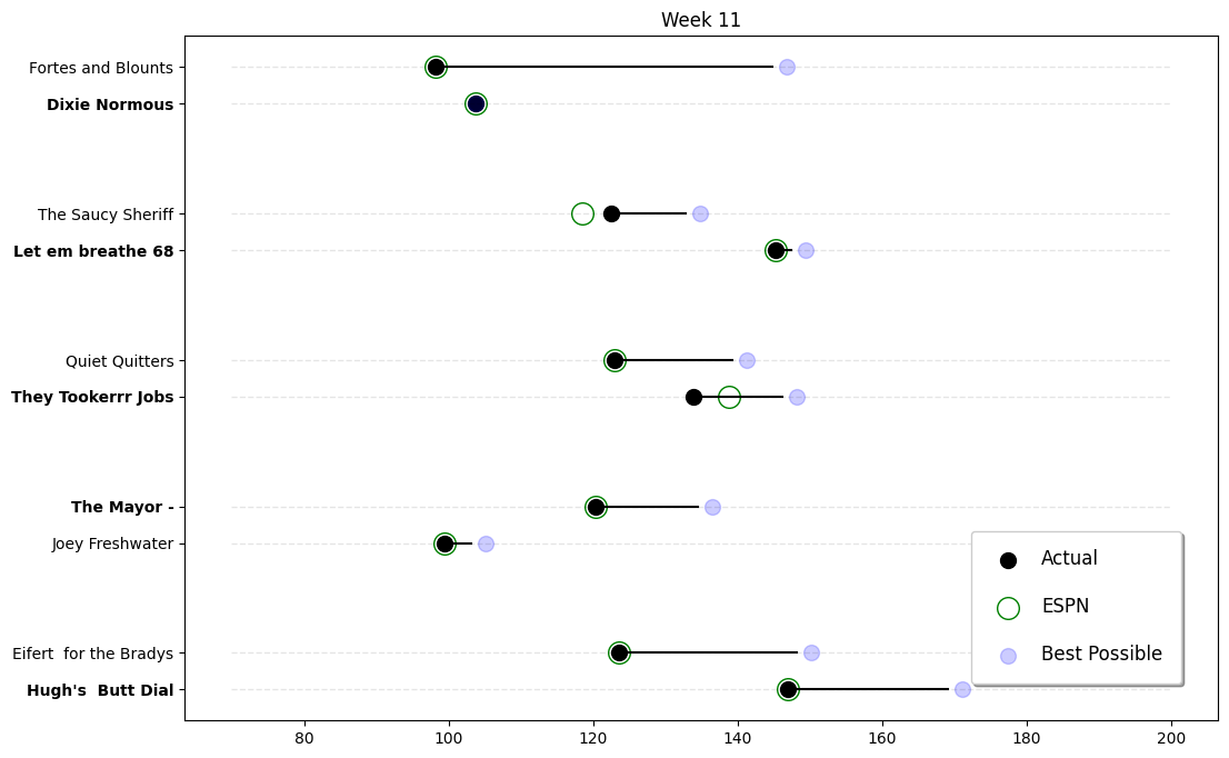 And lastly, Chris (Fortes and Blounts) can officially join the loser’s lounge after managing a pathetic 98.16 against Trevor (Dixie Normous), who at least broke a hundred with 103.7. With scores lower than a Kardashian’s standards, it’s a wonder these teams even bothered to show up! Take a bow, winners, and lower the curtain on these sad sacks who clearly missed the mark. - Fake Commish