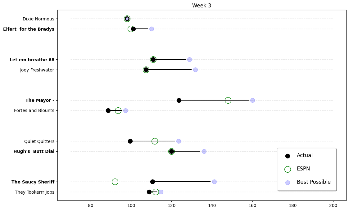 And then we have David, who somehow—SOMEHOW—managed to squeak out a win over Trevor 100.96 to 97.92 despite both of them playing like they forgot it was Sunday. David, you got the luckiest win of the week with a below-average performance that would’ve lost to literally everyone else. You’re like the guy who shows up late to the poker game, plays one hand, wins with a pair of twos, and leaves before anyone can question it. Take your W and don’t look back!
