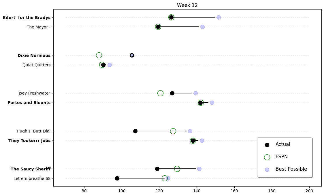 Nick H handled Lee pretty easily with 118.92 to 97.42—Lee’s coming back down to earth after his dominant Week 11 performance. And Trevor got himself a LUCKY win over Nick M 105.26 to 90.04. Trevor, you put up a mediocre performance and won anyway because Nick M continues his personal nightmare of a late season! Nick M has completely fallen apart—from backing into wins with lucky performances to just straight-up forgetting how to play!